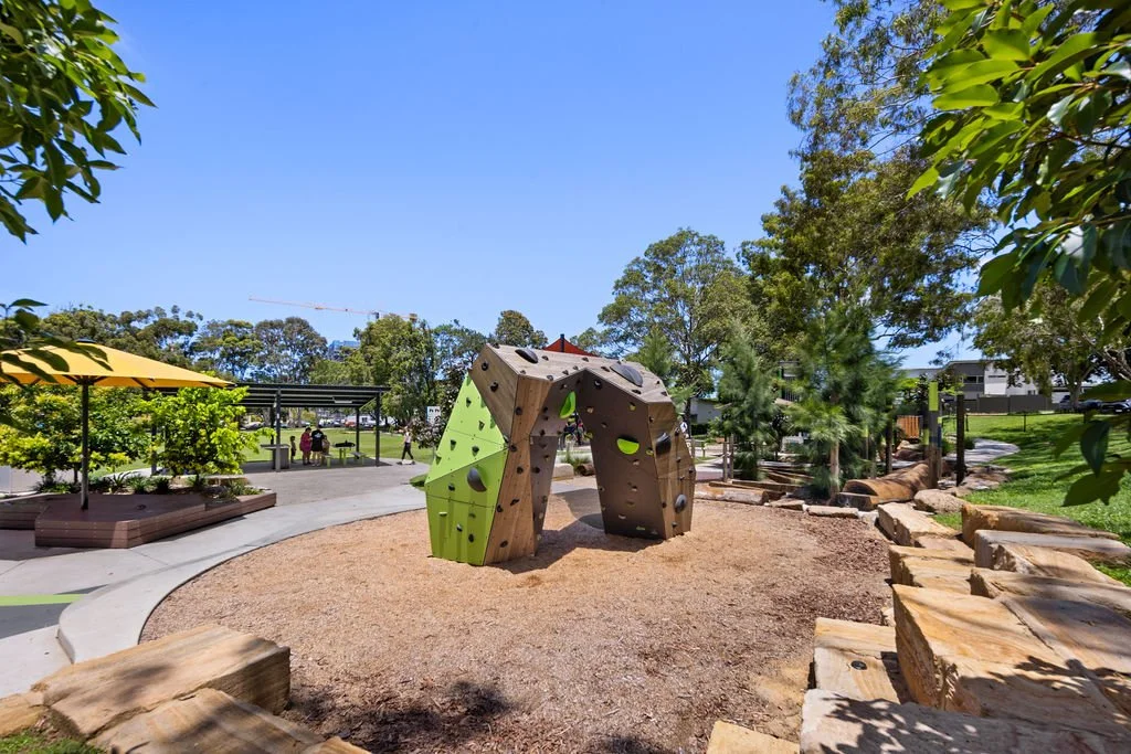 Teen-focused climbing structures anchoring a modern public precinct.
