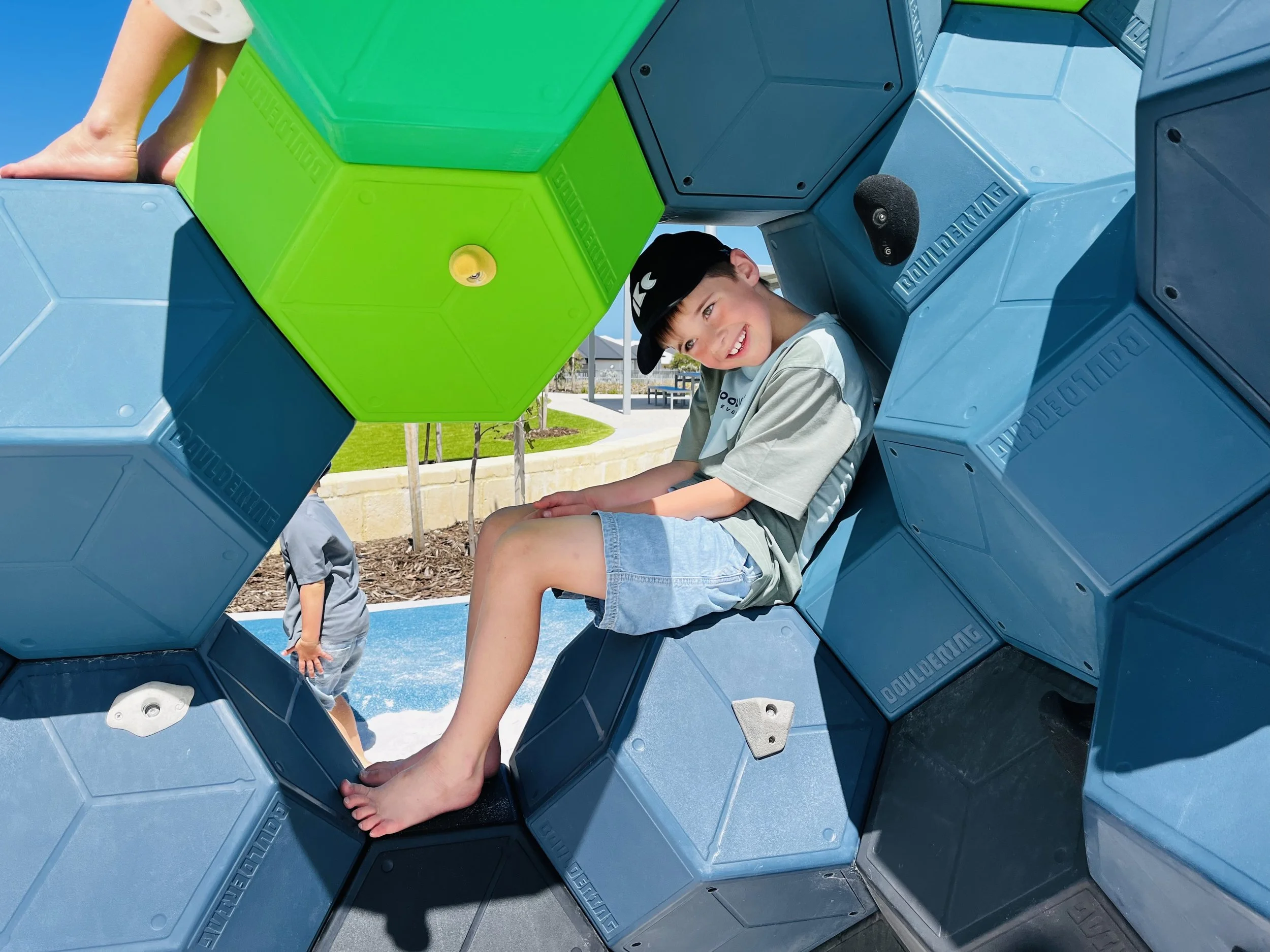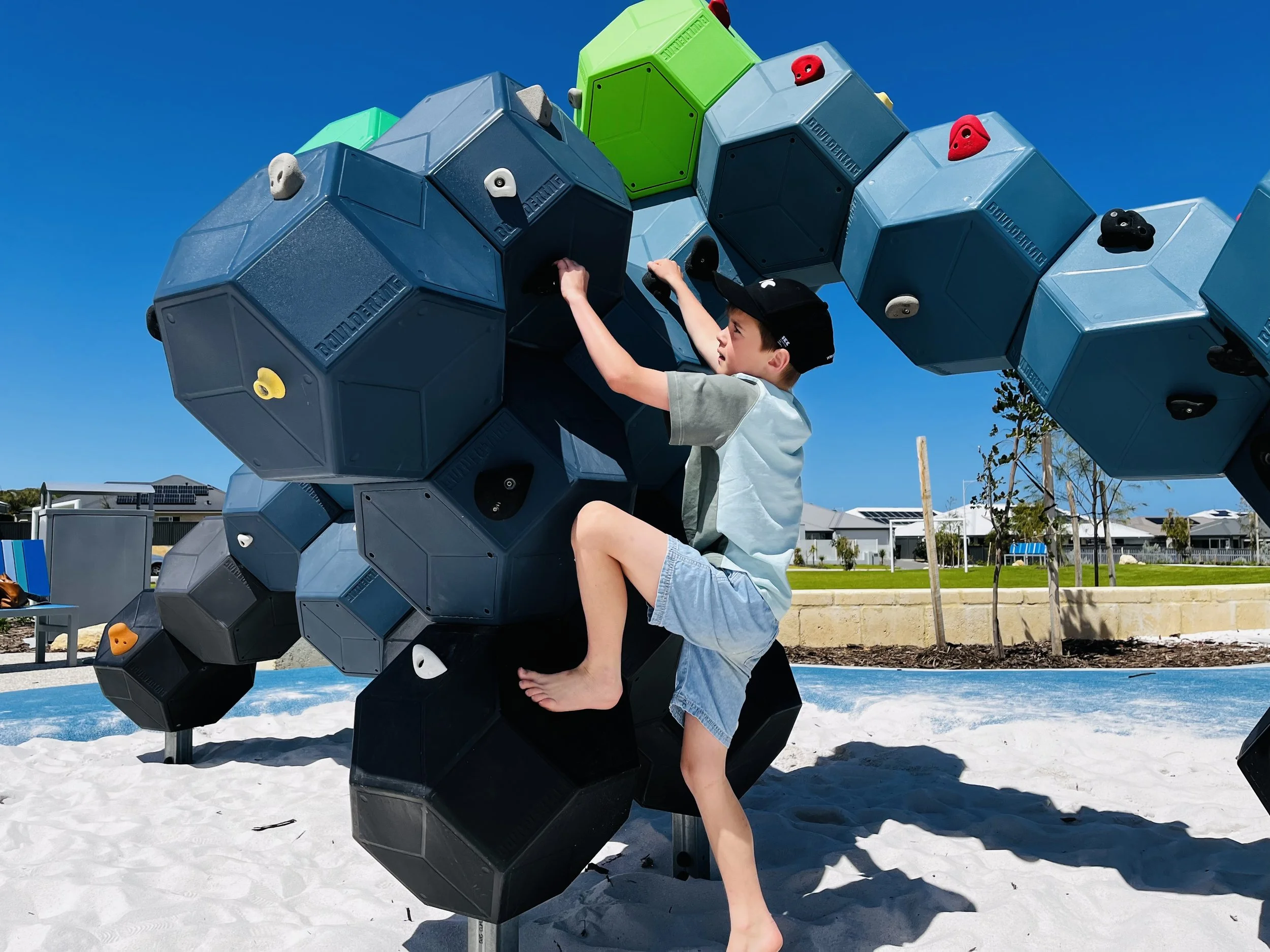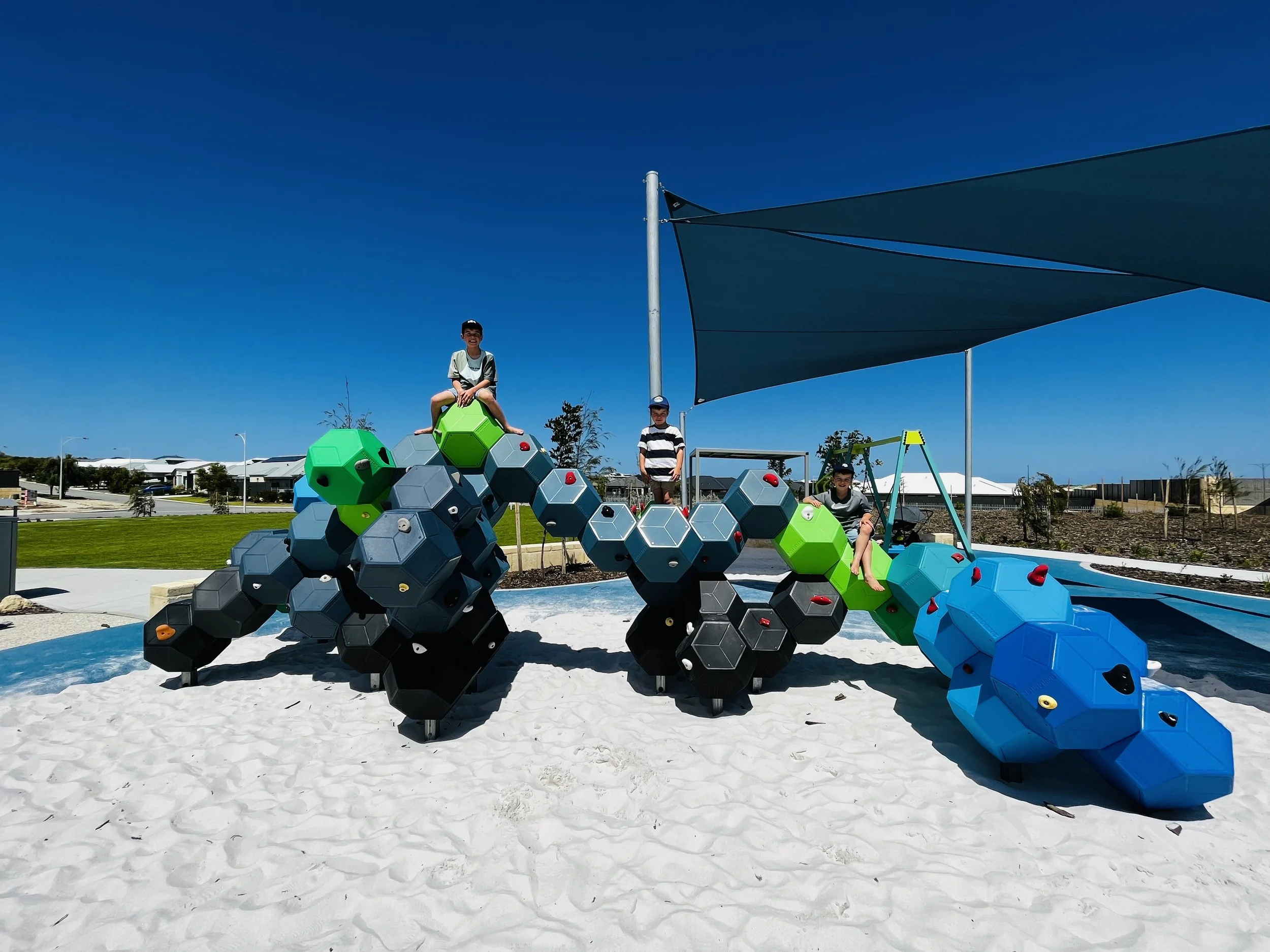 Delivered in a custom blue, green, black and grey palette, the structure was carefully selected to complement the surrounding landscape - echoing ocean tones, coastal vegetation and the layered textures of sand and stone.